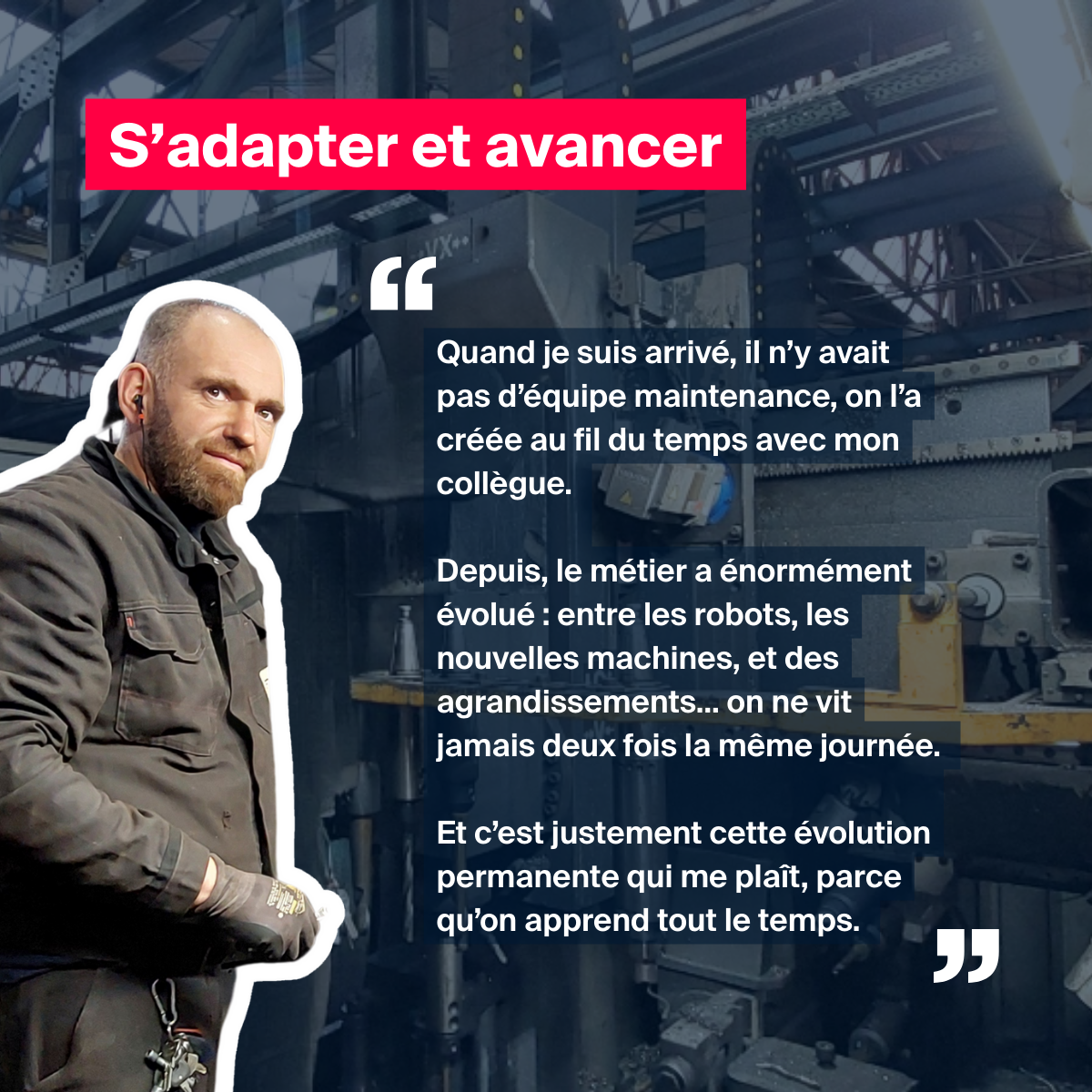 🎞️ Arrivé en intérim en 2008, Florian a évolué d’ouvrier à référent, avec plus d’autonomie et de responsabilités. Il a participé à la création de l’équipe maintenance, accompagné la formation d’alternants et contribué au développement de l’atelier. Entre nouvelles machines, robots et agrandissements, chaque journée est différente et riche en apprentissage.