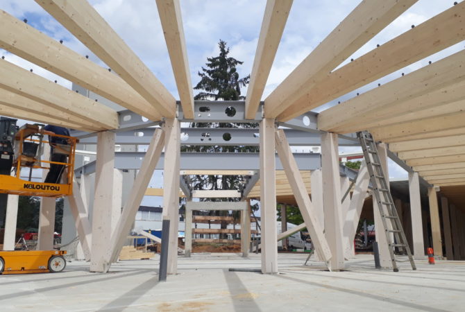 Main structure of the mixed wood/metal/concrete secondary school, timber-framed facades including cladding (wood, steel and fibre cement sheet) and joinery integrated into the workshop and membrane waterproofing. Mixed wood/metal brise-soleils.