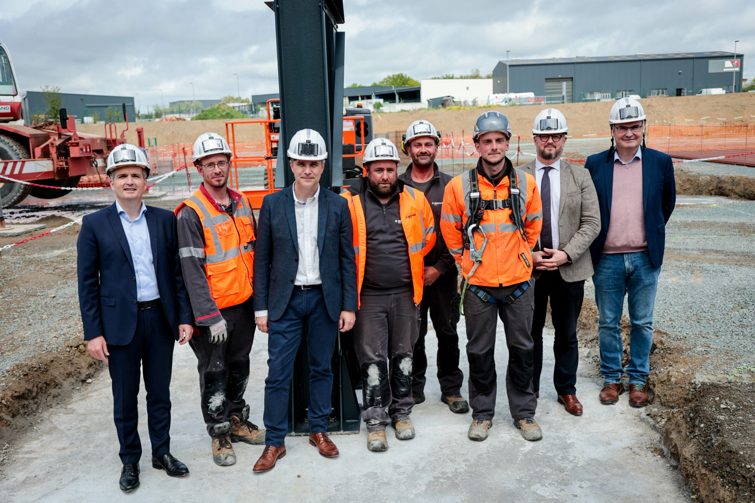 Gil BRIAND, Président du Groupe BRIAND, David GABARD, Directeur Général BRIAND METAL Les Herbiers, Lyon et Aix-en-Provence, Franck GAUTHIER, Maire de Beaurepaire et Christophe HOGARD, Maire des Herbiers et Président de la Communauté de Communes du Pays des Herbiers ont posé et boulonné le 1er fer de la future usine de thermolaquage BRIAND, en présence des collaborateurs des usines du territoire.